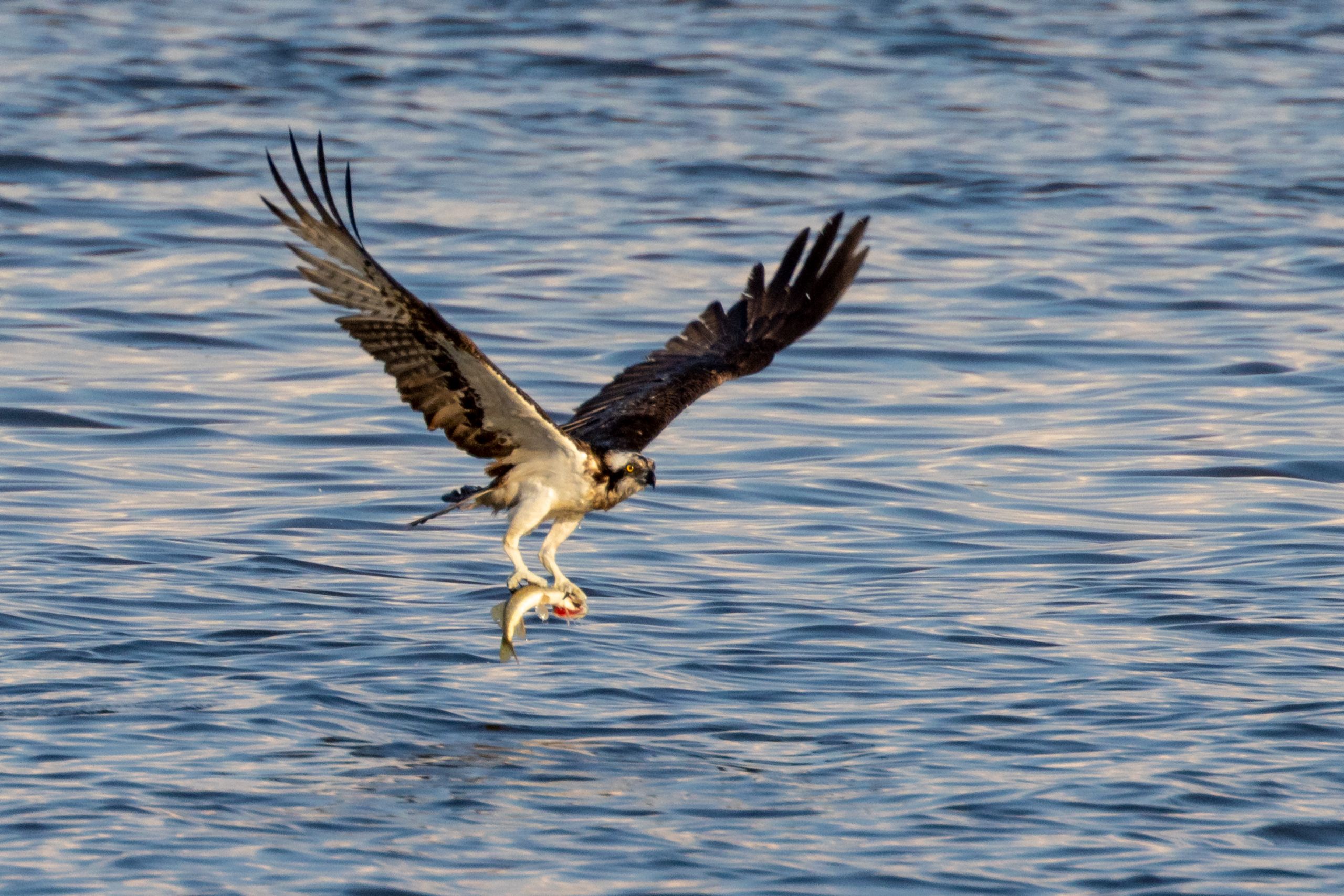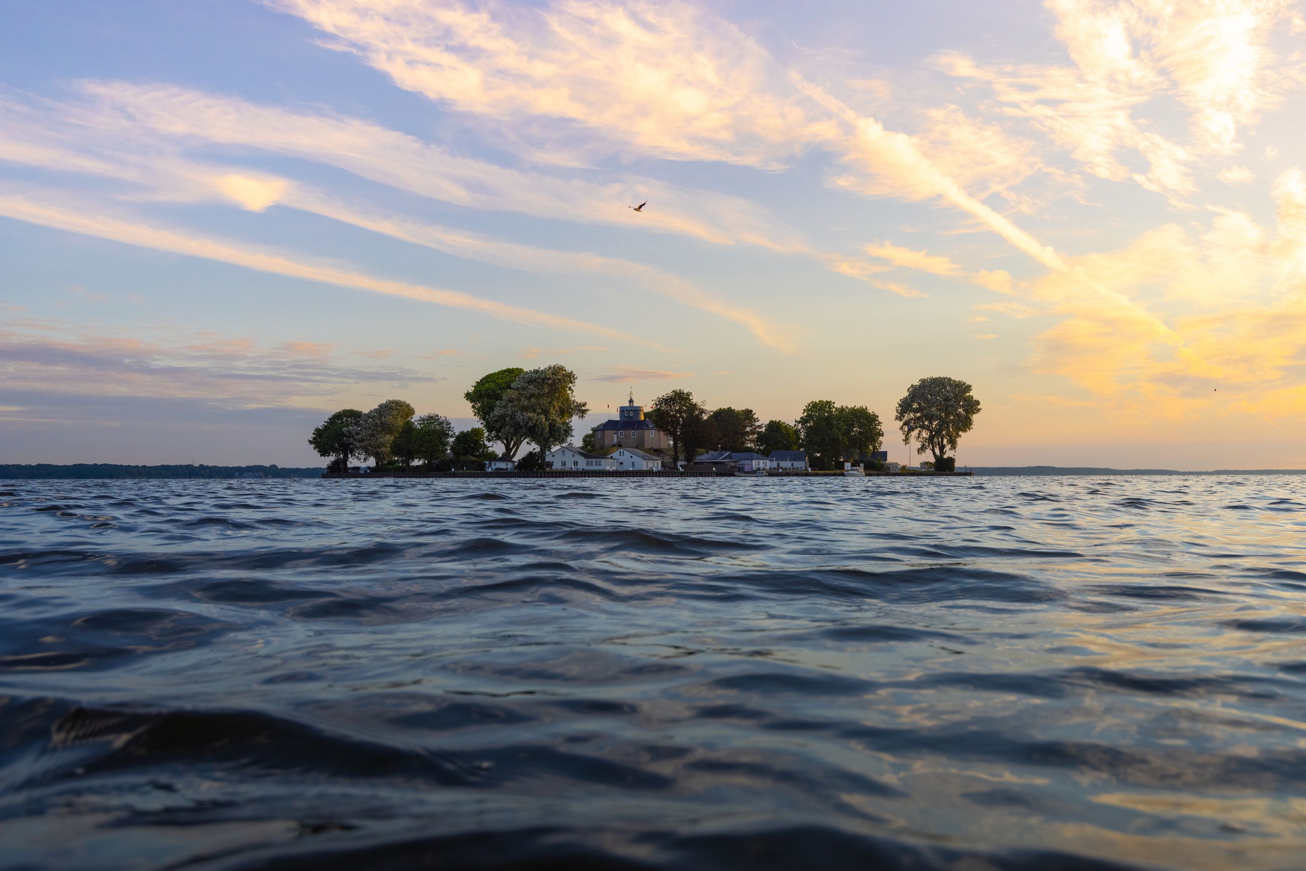 Hoog in de lucht krijst een zeearend, vlak bij de grond zweven vlinders en libellen. Ook badgasten, surfers en zeilboten deinen in en op het water.